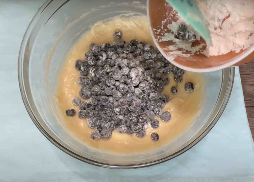5. Fold in the blueberries: Before adding the blueberries into the batter, toss them with one tablespoon of flour to prevent them from sinking into the bottom of the muffins. Gently fold them into the batter with a spatula. Ensure they are well distributed.