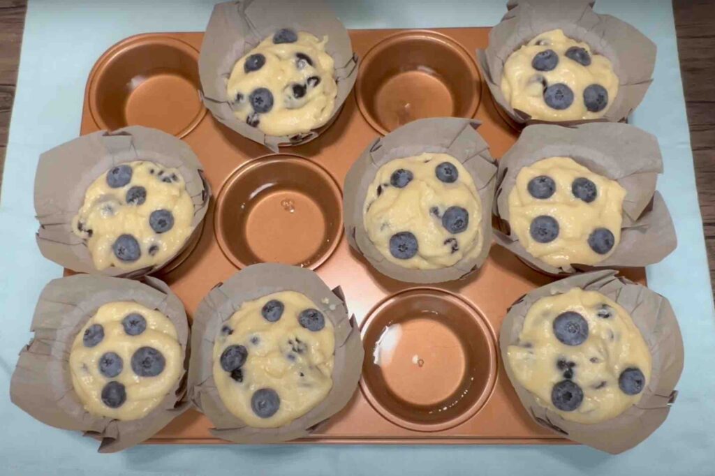 6. Fill the muffin cups: Spoon the batter into the prepared muffin tin, filling each cup about three-quarters full. Top each muffin with extra blueberries if you wish. As an extra step, I like to add a few tablespoons of water to any unused muffin cup spaces in the baking tin. This practice ensures your muffins retain maximum moisture as they bake.